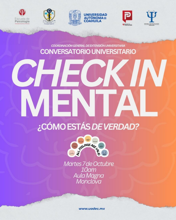 La Universidad Autónoma de Coahuila a través de la Coordinación General de Extensión Universitaria, llevará a cabo el Conversatorio Universitario Check In Mental ¿Cómo estás de verdad?, que se desarrollará del 7 al 14 de octubre en distintas sedes de la institución.