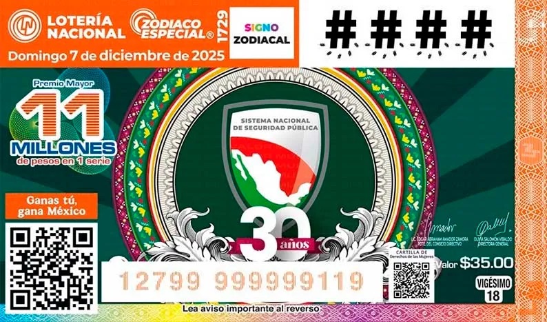Se emitieron 2 millones 400 mil billetes con la imagen del Sistema Nacional de Seguridad Pública, los cuales se venderán a lo largo de todo el país. El sorteo se llevará a cabo el domingo 7 de diciembre, con un Premio Mayor de 11 millones de pesos en una serie y una bolsa total de 43 millones de pesos.
