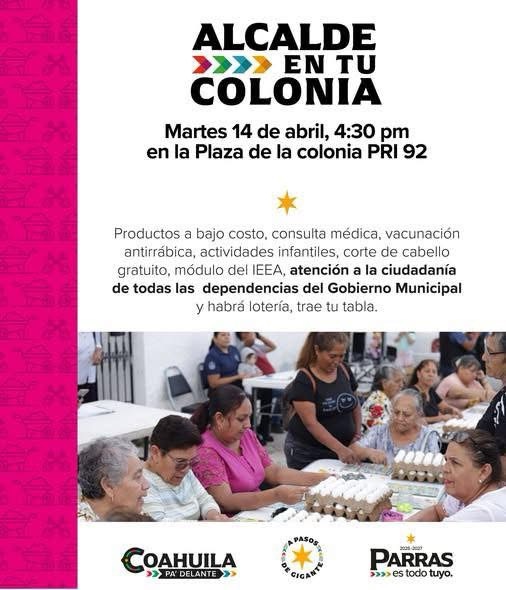 #Parras #Coahuila | El próximo martes 14 de abril a las 4:30 de la tarde, la Plaza de la colonia PRI 92 será sede del programa “Alcalde en tu Colonia”, iniciativa que busca acercar servicios, actividades y apoyos directamente a las familias de Parras de la Fuente.